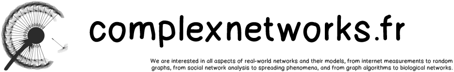 - affinity index algorithm analysis antipaedo attack bipartite blog network blogs capitalisme social Cascade centrality clustering communities community detection community structure complex network complex networks complex systems compression connected graphs data mining debian degree distribution degree peeling diameter diffusion diffusion phenomena distributed measurements DynamicNetworks dynamics edge-Markovian evolving graph eDonkey ego-centered ego-centered communities email epidemiology event detection evolving graphs evolving networks exploration failure fixed points formal concepts gossip graph graph algorithm graph decompositions Graphs hierarchical clustering honeypot influence influence ranking interaction networks internal links internet Internet topology intrinsic time IP-level ip exchanges lattice leaders link prediction long term communities markovian model measurement mesure d’influence metrics Metrology mobile networks Modelling modularity multi-ego-centered communities multi-scale multipartite graph network dynamics node proximity node similarity opinion dynamics outliers p2p P2P dynamics P2P networks parametric paris paris-traceroute path-vector routing pedophile activity phone power-law radar random graph random walks reachability robustness routing routing tables scale-free security simulation simulations sir social networks spreading spreading cascades stability statistical analysis stochastic process three-state cellular automata time-varying Topology traceroute triangles twitter UDP user profiles viral marketing visualization web wifi